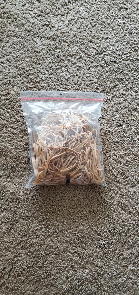 You will then want to take your pants and scrunch them up until they are all bunched up and then secure them in place with as many rubber bands as you need to make it feel in place.