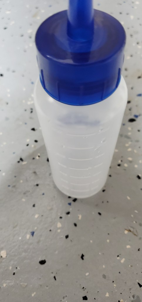 Once you have your pants secured with the rubber bands, you will want to mix your bleach and water. I use a hair dye bottle and add in 4 oz of bleach and 4 oz of water. I then shake the mixture up really well and start to saturate the pants with the mixture. Make sure that you have gloves on to protect your skin, use a tub or sink in the basement, along with making sure you are in a well ventilated area. Once you have everything set up, squeeze the mixture all over the pants until it is fully saturated. For the black pants- you will notice a difference pretty fast and you will start to see the bleach working pretty much immediately. For the purple pants- I did have to add a little more bleach to help the color lift a little more. Use your judgement on how much of the mixture to use, but I never let it sit on that long.