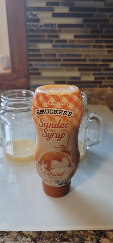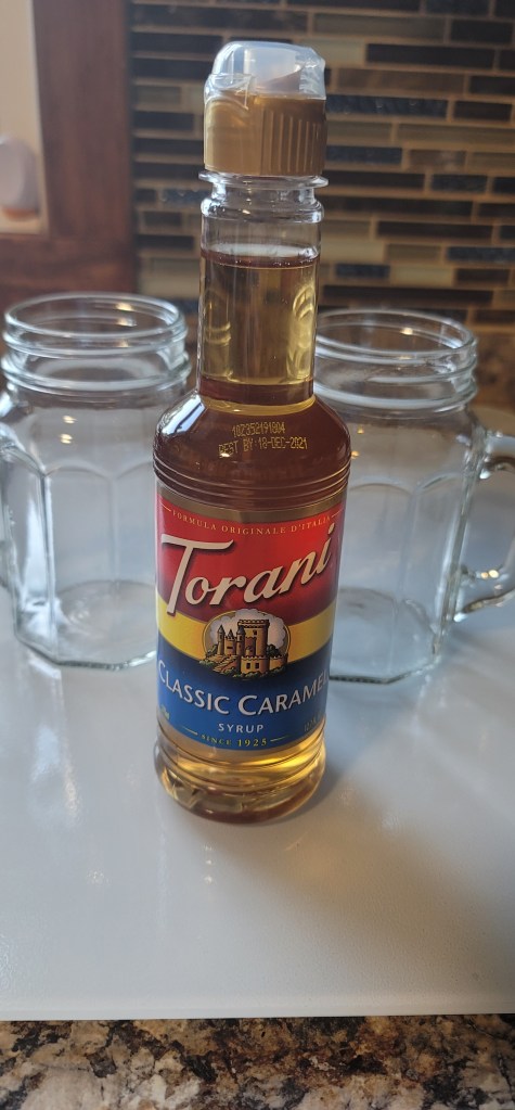 Up next is the fun part! I am starting out by using the Torani Classis Caramel syrup. I used two tablespoons but you can add more or less depending on the type of flavor you want.