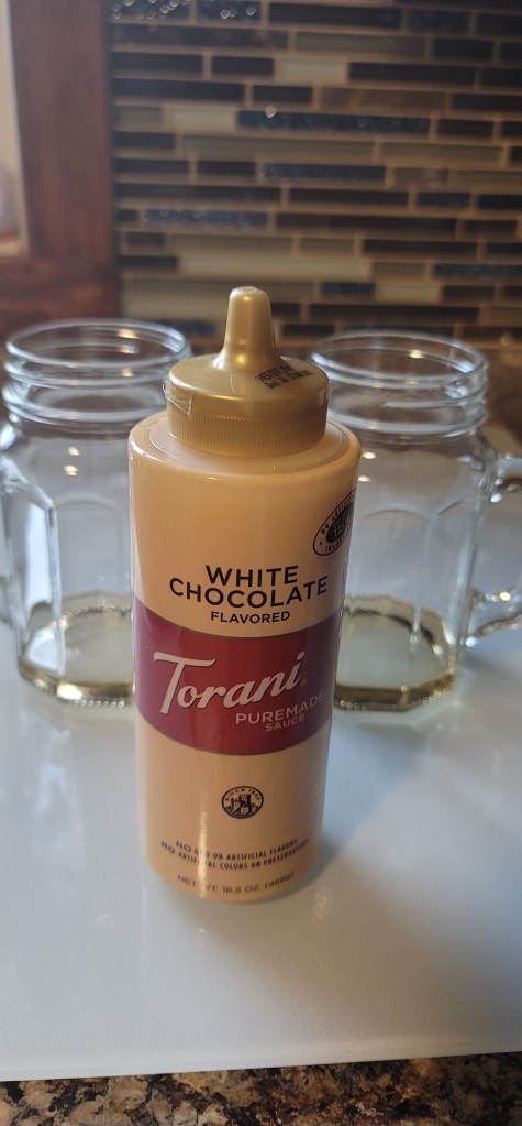 I then like to add a little of the Torani White Choocolate sauce. I just squeeze some on top of the caramel syrup and don’t use a specific measurement, but if I had to guess it would be somewhere around a tablespoon. The only other thing that I would make sure to do after adding these together would be to mix the two flavors so they are not all clumped up on the bottom.