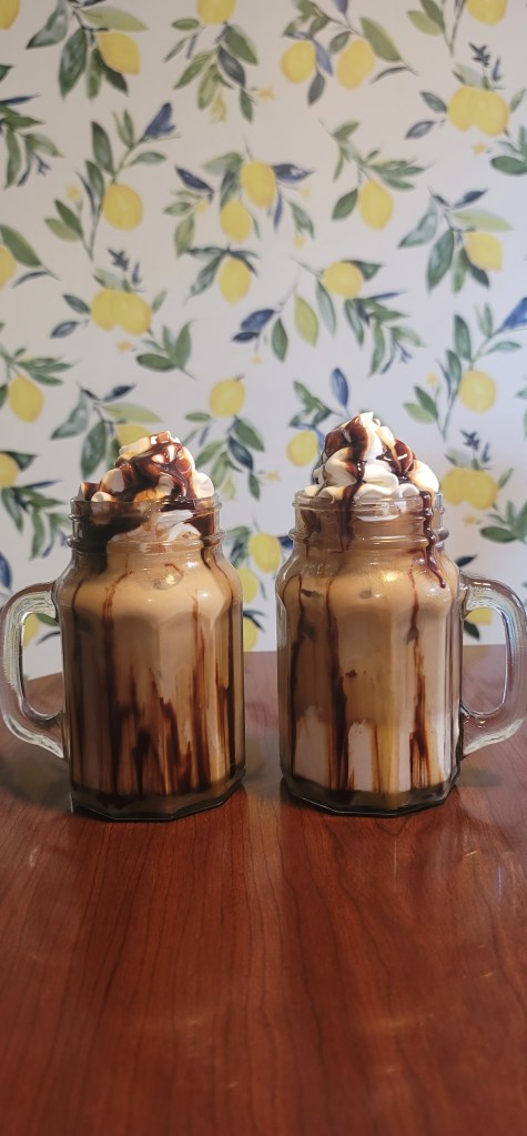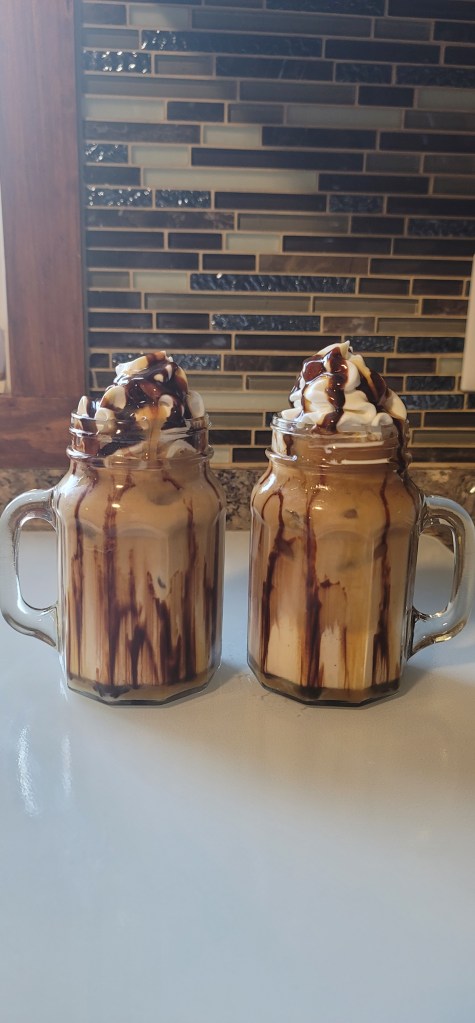 This last step is totally optional, but if it is the weekend and we are trying to enjoy ourselves, we might as well add some toppings. I add some Reddi Whip, caramel and chocolate sauce on top to give me the coffee shop feel.