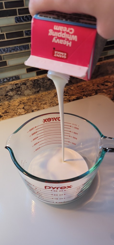 Step 2: Pour 8 oz of heavy whipping cream into a measuring cup and add around 1/2 teaspoon of sugar.