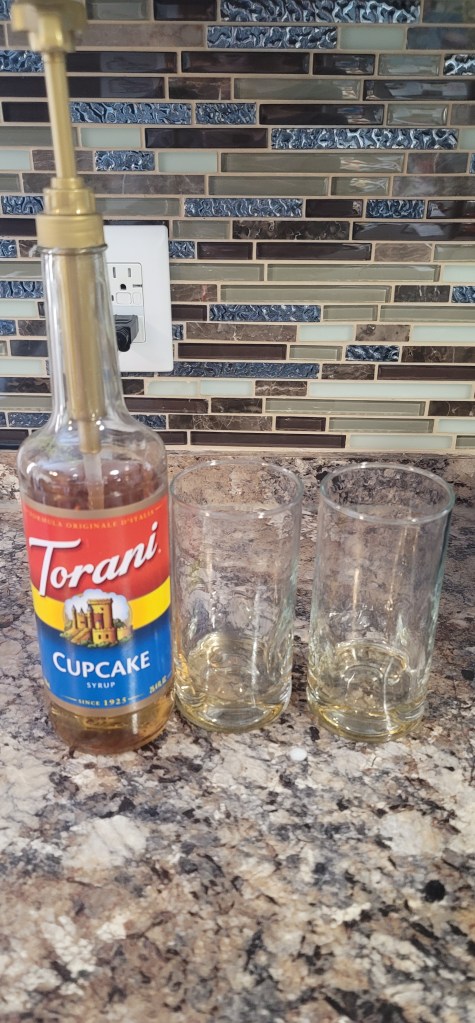 Step 5: Add around 2 pumps of Torani cupcake syrup to a glass.