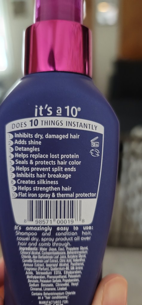 This has been a tried and true product for me for many years. I have not stopped using the “it’s a 10” since the first time I ever bought this. This stuff really works and if you have not tried it before, I highly recommend it. I use this as soon as I get out of the shower and spray it in my hair before brushing. I will include a picture below of all of the amazing things this product does, but my favorite things about this is that is it a great detangler and heat protectant. It is an all in one product in all reality, but check out all of the great features in the picture below.