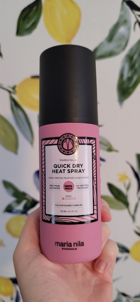 I usually wash my hair at night and try not to dry my hair that often because it is very damaging, but for the times that I do have to dry my hair I always use the “quick dry heat spray” by Maria Nilla. The reason this product is so great it because it does act a heat protector and it also cuts down your dry time. This is great because it helps make your styling time faster which means that is less heat damage.