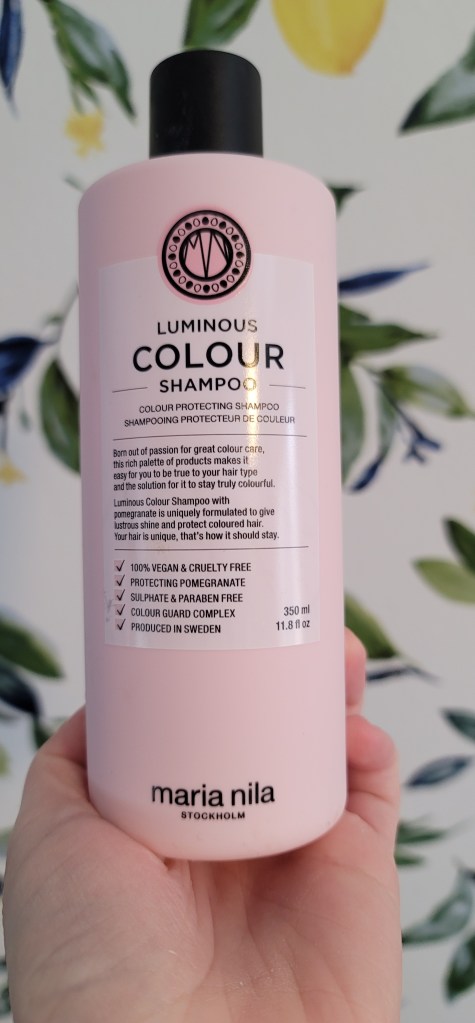 Up first is this shampoo by Maria Nilla. Lately I have been using the “luminous colour shampoo”. It is amazing and from the label on the picture you can see the many different benefits this line has. I feel that it is important to protect your color as much as possible and this shampoo also definitely helps my hair feel soft.