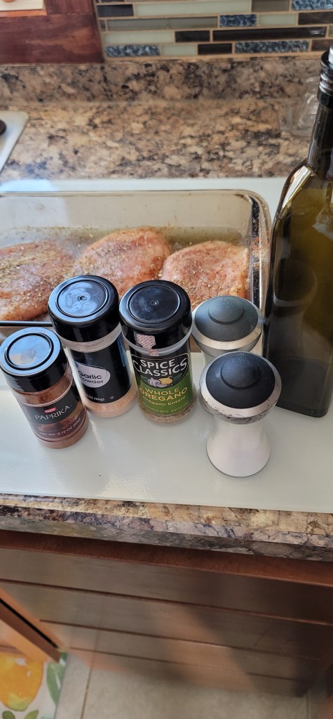 Step 2: While the oven is pre-heating, I start to clean and season the chicken breasts. I put them in a glass baking dish and season them with olive oil, paprika, garlic powder, oregano, salt, and pepper. I do not use any specific measurements for these and I just season both sides until they are covered and then bake the chicken for around 30 minutes or until chicken is not pink. This is the best chicken. Don’t ask me why because it is so simple to make, but it is so delicious!