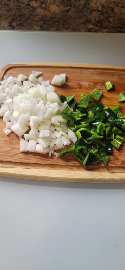 Clean and dice your veggies. You can get as creative as you want with the veggies, but the main ones I recommend are onions, poblano peppers, pinto beans, and corn. These are my go-to. While the chicken is cooking, I clean and dice my onions and peppers and then cook them in a pan on the stove with a little olive oil, salt, and pepper.