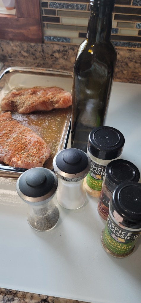 Pre-heat the oven and prepare your chicken. Meat is obviously optional for this dish, but to add a little protein to the dish, I make my go-to chicken recipe. Pre-heat the oven to 450. After cleaning the chicken, I add the breasts into a baking dish and cover both sides with olive oil and then season with paprika, garlic powder, oregano, salt, and pepper. This chicken is amazing, and you will love it! I bake this in the oven for around 30 minutes.