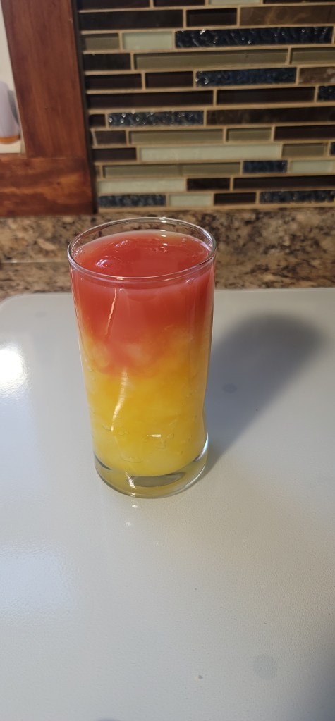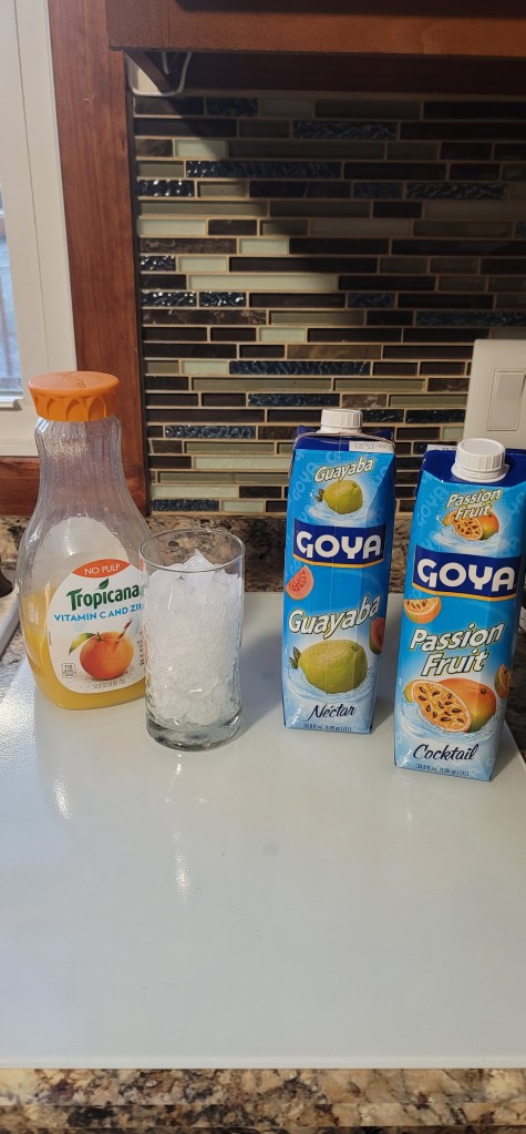 You literally just need a big cup filled with ice and then this recipe just needs three ingredients: orange juice, Goya guava juice, and Goya passion fruit juice. Just pour in equal amounts of each juice into your cup, stir together, and enjoy. We are missing Florida and Disney in my family right now and making this drink brings back some fun memories from trips we have had. Try it out and let me know what you think. I will be back soon with some more yummy creations soon.